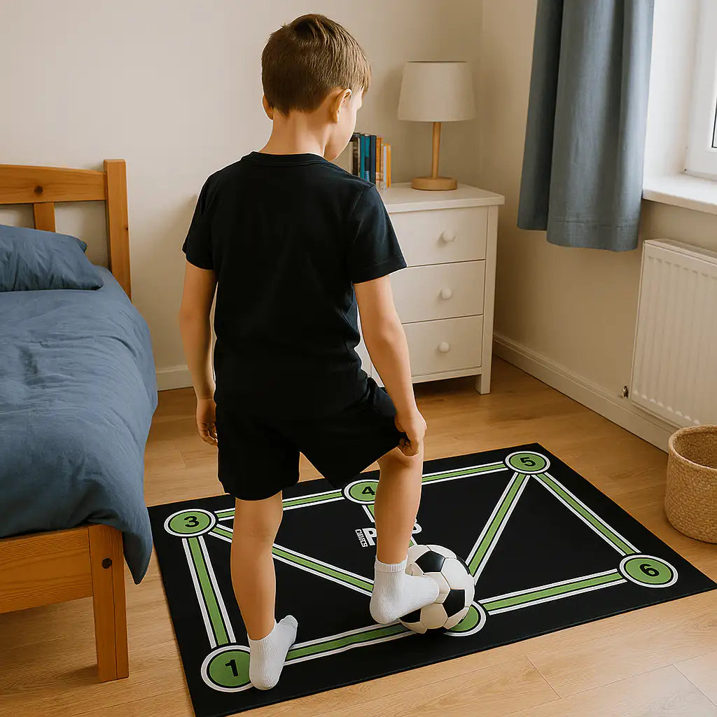 A football training mat is a tool designed to help players improve their ball control, footwork, and coordination. It features numbered zones and arrows that mimic in-game movements, helping players build confidence and speed with the ball.